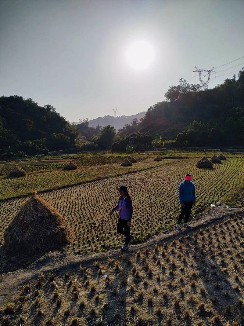 冬日的村野,午后的阳光热烈地照射着,全无一点冬的肃杀与凄清,收割过的稻田留下密密麻麻的稻茬,有的稻茬中间夹杂着新长出的嫩绿秧苗;种芋头的田里,一垄一垄的,芋头叶梗跟野草一样萎黄枯干;走在田埂上,背后的阳光将身影拉长投下,田埂下的沟渠,大多干涸,也有见到有水的,水中有小小点不知名植物,褐红深绿,生机黯然。