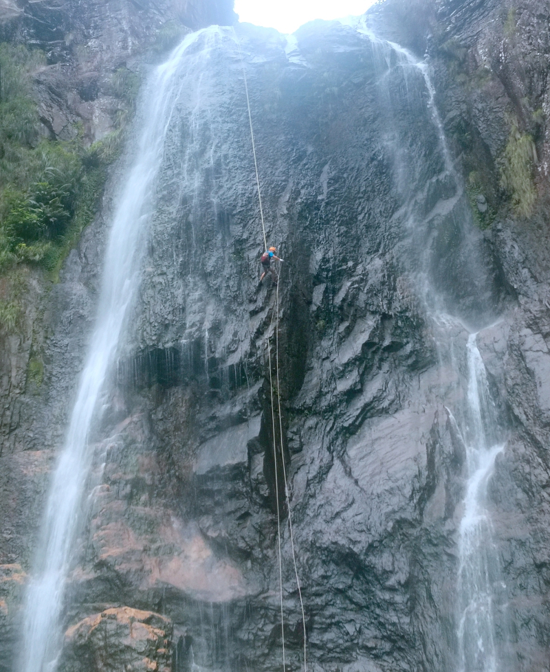 十二重溪唯一的难点就是悬谷瀑布。瀑降是很成熟的技术,只要掌握了,是非常安全的(当然是真的懂,不是半吊子)。