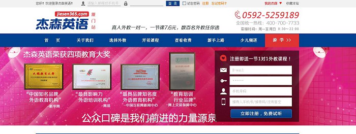 | 活动基本信息 报名参加活动 活动详细内容 组织者口碑(0) 非常感谢英语爱好者对杰森英语的支持与关注,杰森英语自2006年,开办至今,少不了各位英语爱好者的爱戴与支持,杰森英语能有今天的成绩,真的要感谢各位英语爱好者的支持了。为了回馈大家,杰森英语2014年新一轮的体验课报名活动开始啦。 ……………………………………报名要趁早哟………………………………………… 对于还不是很了解杰森英语的英语爱好者们,请允许我在下边为大家做一个稍微详细点的介绍吧。 杰森英语隶属于杰森环球(北京)教育咨询有限公司,总部位于中国北京,韩国知名在线英语机构杰森集团参与投资,是国内在线英语培训的领军企业。杰森集团在菲律宾拥有一所当地影响力 很大的杰森英语外教语言学院,该学院成立于2006年,长期为亚太地区的学员提供专业的英语游学短训服务。依托杰森学院资深的英语教学经验, 雄厚的师资力量以及优质的服务团队,杰森英语现已发展成为国内最大的在线英语培训机构之一,累计服务学员超过5万人次。 杰森英语致力于改变中国人聋哑英语的现状,让最广大的中国人说一口流利的英语是我们的最高使命。优质专业的外教,1对1最佳上课模式, 便捷的网络工具,朴实的平民学费构成了我们杰森服务的核心骨架。而这些元素正是代表了未来语言培训发展的长远方向。 杰森英语成立以来,学员呈现快速的几何数增长,越来越多的人了解到原来学习英语可以不用再受奔波之苦,不用花这么多钱,不用旷这么多课,不用担心学习效果,而只需简简单单地打开电脑,点击你想要的外教和方便上课的时间,课就约好了,到了约定时间外教主动打你 Skype或QQ开始上课,您可以定制自己的上课内容和所用教材,您也可以完全只是free-talking或者和老师学唱英文歌,想学什么就学什么,学了哪个就会哪个。 目前我们开设的有日常英语、学生英语、商务英语、出国英语、行业英语、时事英语、娱乐英语、自由会话等八大课程体系。提供了剑桥、新概念、牛津、高考、雅思、托福、签证、面试、旅游、出国考察、管理、导游、酒店、饭店、餐厅、医护、银行、外贸、金融、IT、警务、商铺、秘书律、会展、批发零售、房地产等百余种教材,给学员更多的选择空间! 如果您想利用假期时间去菲律宾当地体验游学的美妙感受,学会在全英文的环境下学习和生活,同时再进一步提高。 杰森英语入驻厦门。杰森致力于做平价英语,每节课最低7.6元,最高22元。与纯外教通过QQ或Skype视频互动交流学英语,无需每天往返于路途遥远的培训机构奔波,在家即可学英语:只需一台电脑,一根网线,一个摄像头,一副耳麦。网络教学是一种新型的学习方法,为了增加广大客户对杰森的信任度,杰森已开设了一家实体体验店,体验店地址:厦门市思明区卧龙晓城505号303。从即日起,欢迎各位英语爱好者前来免费体验。后续将会在海沧、湖里、集美、翔安、同安都开设实体体验店分店。同样的每周六下午三点到四点举办英语角聚会活动,现场提供咖啡饮料,不收取任何费用,所有费用由杰森英语支付,场地由杰森英语提供。现场资深外教或中教与大家用英语互动。英语角地址:厦门市思明区卧龙晓城505号303。欢迎加入新型英语交流群:103496882。活动具体安排以群通告为准。英语不是写出来的,而是大声勇敢的说出来的。 开设课程囊括:日常英语、学生英语、出国英语、商务英语、行业英语、时事英语、娱乐英语、自由会话等十个课程。 杰森英语走的是平价路线,旨在能让所有想学英语又苦于学费太高的人们有一个有效的学习英语的平台。 另:厦门杰森英语每周六都会将所有在厦学员召集在一起举办一个免费的互动活动,对现场的VIP学员每人送精美礼品一份,欢迎大家踊跃参与!! 官网:http://xm.jiesen365.com 详询Tony:15159213306 固话:0592-5259189 新浪微博:@厦门杰森英语 ![]() ![]() ![]() E部落提醒报名活动会员 报名参加活动应注意:对于在非公众场合或较偏地点举办的活动,最好带上若干朋友一起参与;活动结束后,不要随便接受不熟悉会员的接送。对有一定风险的活动,请尽量选择有代购保险的参加。如果您确认报名参加活动,即意味着您愿意自己承担此部分风险及由此可能产生的一切责任与后果。 已报名会员名单(共1人,含会员1人,外带0人。括号中表示外带人数) 男会员∶ 暂无任何男会员报名 女会员∶ | |