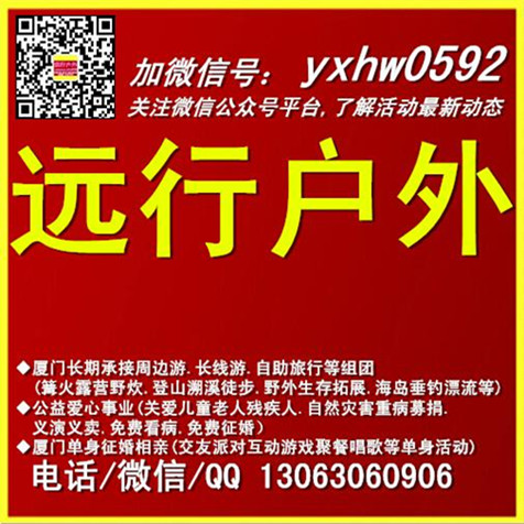 | [4楼] ◆厦门公益爱心事业(关爱儿童老人残疾人.自然灾害重病募捐.义演义卖.免费看病.免费征婚 ◆厦门户外:福建长期承接周边游.长线游.自助旅行等组团 (篝火露营野炊.登山溯溪徒步.野外生存拓展.海岛垂钓漂流.运动健身等) ◆厦门单身_厦门征婚_厦门相亲(厦门周末活动_厦门交友派对_厦门聚餐唱歌等) ◆吉他民谣弹唱80/时,上万吉他上门教学(一周学会简单歌曲) ◆铁观音包邮送茶具货到付款(安溪自营百亩茶园) ---给你拉近单身群/户外群/公益群,加【电话/ QQ /微信】13063060906 ---给你拉近单身群/户外群/公益群,加【电话/ QQ /微信】13063060906 ---时时了解活动最新动态,加【微信公众平台】yxhw0592 ---时时了解活动最新动态,加【微信公众平台】yxhw0592 | |