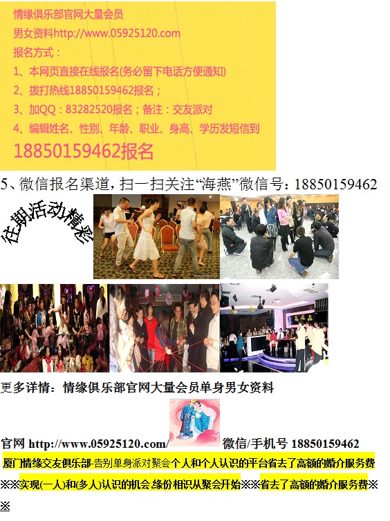 | [2楼] 微信报名渠道,扫一扫关注“海燕”微信号:18850159462 ※※※厦门情缘交友俱乐部是针对个人和个人认识的平台,中间环节不经过婚介实现一人和多人认识的机会,省去了高额的婚介服务费,大大促进成功率,为方便单身朋友有更多的选择机会倾力为全鹭岛单身朋友搭建高效优质的交友平台。 乘车路线::吕厝北站下车-途经公交车:乘公交车27路、44路、、108路、109路、508路、651路、657路、658路、659路吕厝北站下车牡丹酒楼六楼大麦626包厢主持人组织一起K歌,爱唱歌的可以尽情展示,不爱唱的也有小菜茶果盘少许酒水供大家享用。 趣味游戏具体内容期待现场揭晓!参加(不管男女皆可带朋友一起过来的哦) 聚会主要目的,扩大自己的社交圈等等 | |