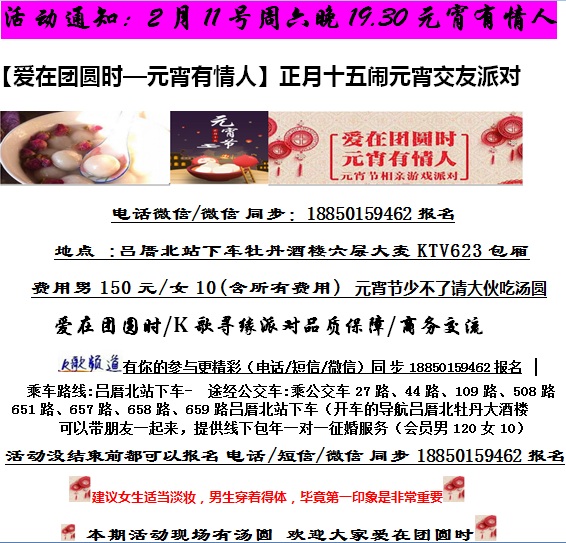 | [2楼] 活动通知:2月11号周六晚19.30----元宵有情人 【爱在团圆时—元宵有情人】正月十五闹元宵交友派对 ★★★★★★★★★ 到场均有大礼赠送 欢迎光临 ★★★★★★★★★★★★ ![]() | |