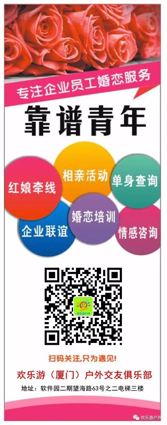 | 活动基本信息 报名参加活动 网上付款退款规则 »会员在截止报名前未收到邀请信及平台手机通知短信的,视为未获邀请,已付款项将自动退还至个人账户(手机号码请确保正确)。 »本活动截止报名前任何时刻退出报名,网上已付款均全额退还。 »活动过程中遇上纠纷,请在活动结束后三天内从已报名活动中发起申诉;无申诉的,视为同意在活动结束三天之后自动结算已付款给组织者。 活动详细内容 组织者口碑(0) ![]() ★[活动前言] 单身的朋友有没有同感,越是到下雨天越会感觉到孤独,据说下雨天相亲成功率更高哦世界上最远的距离,不是瞬间便无处寻觅,而是尚未相遇,便注定无法相聚。 爱情永远不是站在原地等待,而是需要努力争取,即使远隔千里,仍然有机会与他相遇,相识,相爱…… 你还在等什么?赶快行动起来,参加我们的活动吧!寻找你的Mr.Right,更多精彩等着你…… ![]() 【主办方】: 一、欢乐游(厦门)户外交友俱乐部 二、靠谱青年-专注厦门企业职工婚恋服务! 【招募对象】:各大企业单身上班族 【活动费用】: 活动费用30元/人 【活动地址】:软件园二期望海路63号之二3楼 【报名方式】:编辑交友+名字+电话+生活照一张 发送至:13489039035(上官)微信/QQ同号 【活动确认】:预报名,需对报名信息筛选,确保人数和比例,以电话或微信通知报名成功为准。 ![]() ★【参加人群】 在厦门有稳定工作或收入,都市白领,IT业,国企,事业单位,教师医生,公务员,金融贸易类,设计类,企管,自营等居多,参加活动人士为热爱生活、真诚、靠谱的优秀单身男女 ★【参加目的】 给单身朋友提供健康,正规,快捷的交友平台,大家也都是因为平时认识其他人的机会非常有限,想扩大自己的交际圈,寻找适合的婚姻伴侣 ★【活动类别】 八分钟约会,棋牌茶话会,闪电速配,有缘对对碰,爱情300秒,电影相亲会,交际舞会,户外郊游,七天情侣,漂书觅友,影缘相会等。 ★【活动宣言】 “你们用心,我们靠谱”。青春不常在,抓紧谈恋爱。不要守株待兔,2017年不做宅男宅女,下班后我们去相亲! ![]() 现场更有红娘帮助传递爱的信息,把爱的讯号传递到TA面前,缘来,竟可以这么简单~ -安排最适合的聊天方式、互动形式、游戏内容,让大家更好的与异性朋友互动、交流 - 男女比例各半,活动过程自然推进,绝对不会让你尴尬 - 最后会给大家自由交流的时间,愿意认识的人可以互留联系方式哦 ![]() [活动好处] 1)真实:每个参加者都是以真实身份真诚交友 2)高效:更多的交友机会、更直接的交流方式,为寻找心意对象创造了机会! 3)轻松:温馨的气氛、愉悦的心情、自然的沟通、放松减压、交友娱乐两不误! 4)经济:更节约交友成本{时间和金钱},以更少的活动经费结识更多高层次的朋友! ![]() 在现场你能感受到:一对对,一双双,或畅谈人生,或笑语飞扬,你可以跟有眼缘的朋友一对一去认识,也可以玩玩桌游谈笑风生,或是跟主管们聊聊自己和对未来另一半的要求,和未来的TA来一场精准的邂逅! 活动持续到晚21:30点结束。离开时,将会有不少男嘉宾们主动地送女孩回家,两人可以更加轻松自然的相处,或畅谈人生理想,或浪漫风趣,并相约再次见面。一段浪漫故事从此演绎.......... ![]() 咨询活动(手机或微信): 13489039035(上官) 关于我们: 欢乐游(厦门)户外交友俱乐部 欢乐游(厦门)户外旅行俱乐部 靠谱青年-专注厦门企业职工婚恋服务! 擅长业务: 户外交友、企业联谊、婚恋培训、红娘牵线、单身查询、情感咨询 户外旅行、散客组团【出境/国内/周边等纯玩旅行+户外登山/野炊/露营等】 承接企业部门、校园班级、社区亲子团队春/秋游、会议旅行、团队拓展。 厦门靠谱青年婚恋机构,针对有婚恋意愿企业上班族,独创“婚恋培训+相亲活动+红娘牵线+线上相亲+企业联谊”高效系统婚配服务,并提供专业的恋爱指导和情感咨询服务!公益相亲和会员服务并存!帮助企业员工找对象!专业、高效、口碑! E部落提醒报名活动会员 报名参加活动应注意:对于在非公众场合或较偏地点举办的活动,最好带上若干朋友一起参与;活动结束后,不要随便接受不熟悉会员的接送。对有一定风险的活动,请尽量选择有代购保险的参加。如果您确认报名参加活动,即意味着您愿意自己承担此部分风险及由此可能产生的一切责任与后果。 已报名会员名单(共3人,含会员1人,外带2人。括号中表示外带人数) 男会员∶ 官仔 (+2) 女会员∶ 暂无任何女会员报名 | |