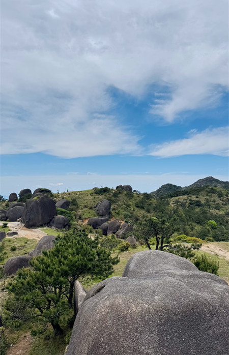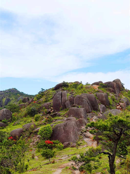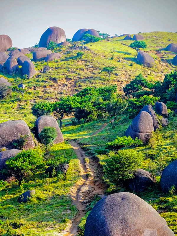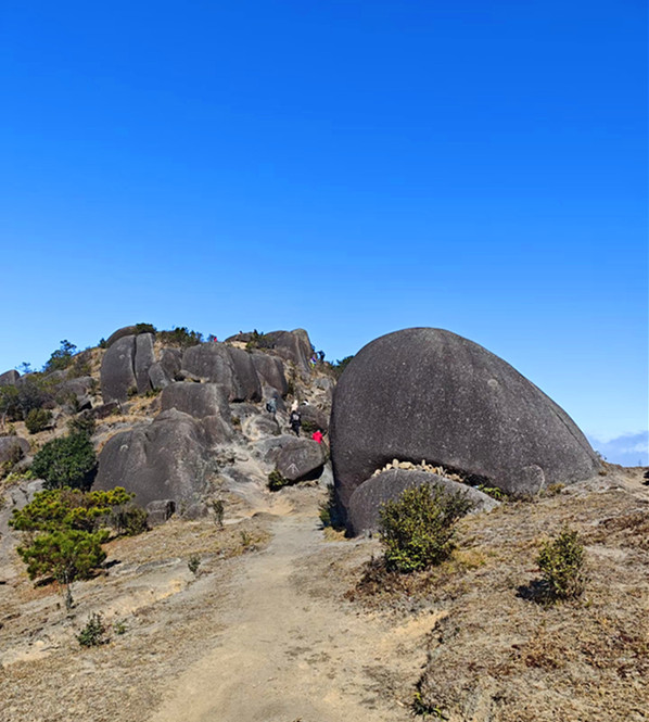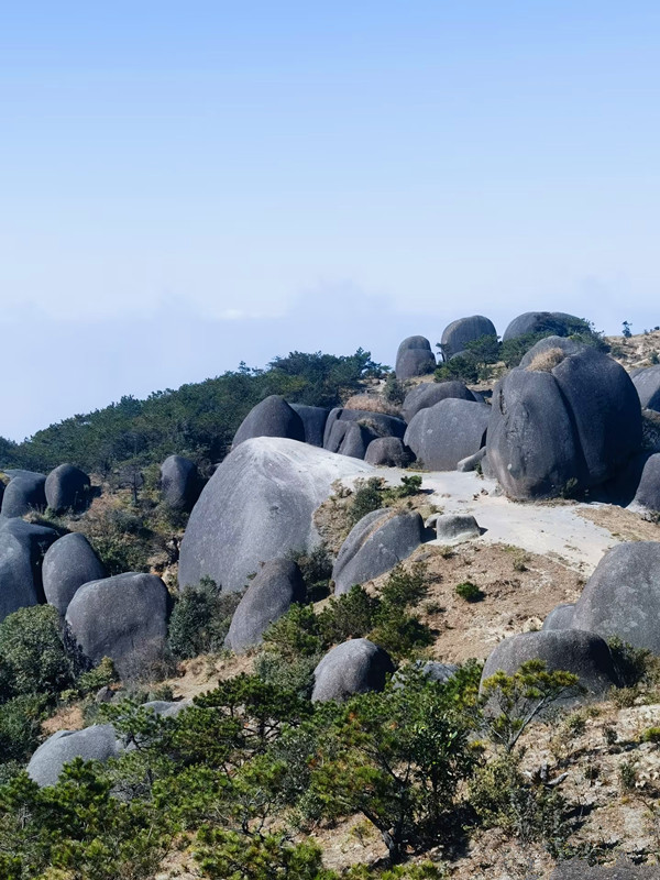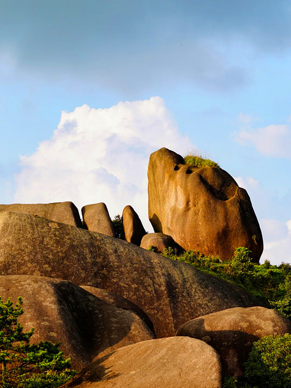 狗子脑因其地貌像只狗的脑壳而得名,当地也有人称其为石门山,是花岗岩断块山,山顶有典型的"一片瓦"和石蛋地貌景观,山顶还有鲨鱼石、靴子石、仙桃石、元宝石等奇石。
