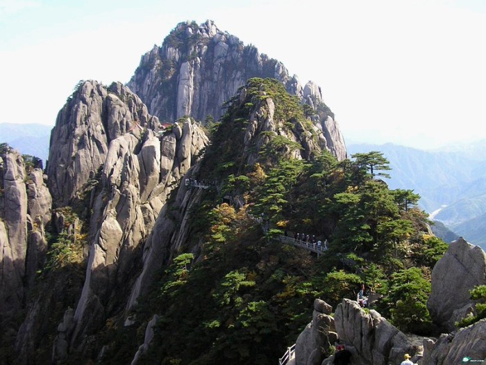 黄山:位于安徽省南部黄山市境内(景区由市直辖),为三山五岳中三山之一。黄山为道教圣地,遗址遗迹众多,中华十大名山之一,有“天下第一奇山”之美誉。郦道元、李白、徐霞客等名士都曾在此留下壮美的诗篇和历史的足迹。黄山是中国最美的、令人震撼的十大名山之一,同时又是著名的避暑胜地、国家级风景名胜区和疗养胜地,入选“中国旅游胜地四十佳”。黄山于1985年入选全国十大风景名胜;1990年12月被联合国教科文组织列入《世界文化与自然遗产名录》;2004年2月入选世界地质公园。 黄山是我国十大风景名胜之一,也是全国唯一拥有世界文化遗产黄山集中国各大名山的美景于一身,尤其以奇松、怪石、云海、温泉“四绝”著称,是大自然造化中的奇迹,历来享有“五岳归来不看山,黄山归来不看岳”的美誉。