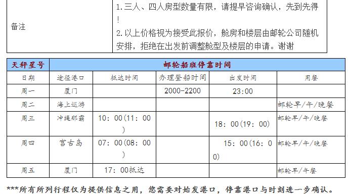 注意:以上出发时间仅供参考,具体安排以天秤星号船上公布为准,办理登船及集合时间(见出团通知书)另行通知。