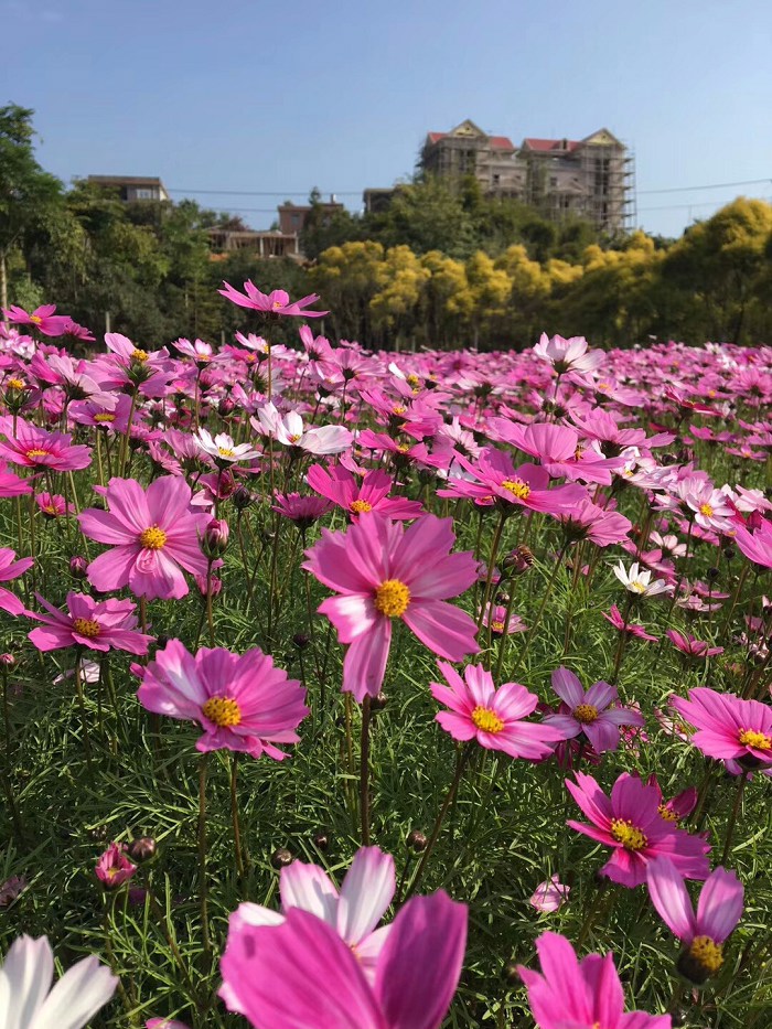 前格村花海再次绽放,虽这一次也是波斯菊,但已换了一个品种,叫七彩波斯菊,。这一次更加的五彩斑斓,更加贴近春的色彩…
