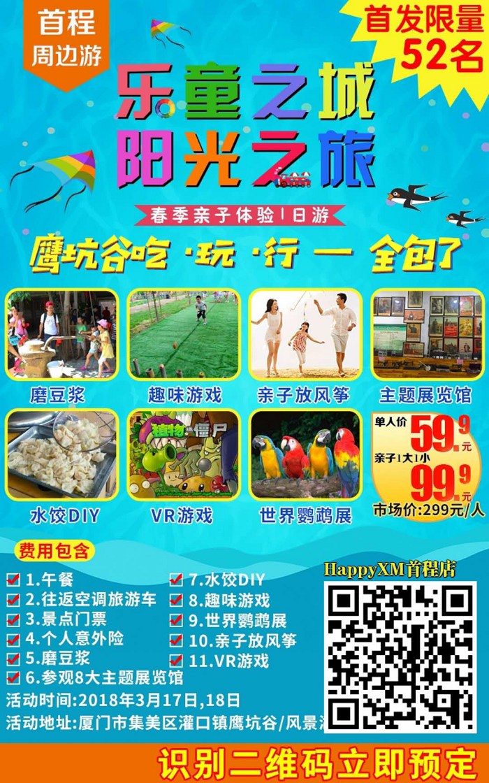 ![]() |  | |  | ![]() | 集合时间、地点:岛内:08:30 sm城市广场肯德基门口 活动地址:厦门市集美区灌口镇鹰坑谷/风景湖 活动日期:3月17日,18日 【行程安排】 08:30:sm集合上车,出发前往集美灌口灌口鹰坑谷。 09:30:参观8大主题展览馆:小刀会,辛亥革命,红色馆,国学馆,农耕民俗文化馆等。纯撒野没意思,展览馆能让小朋友或多或少了解一点知识。有心的家长,可以和孩子比试一下,看谁记的东西多。 10:00:磨豆浆: 石磨磨豆浆,现场煮熟饮用,享受原汁原味的豆浆,生津解渴,老少皆宜。孩子最喜欢新鲜的东西了,豆浆是怎么做出来的呢?他们的小脑瓜里总是有很多问号。这回呀,亲自上阵磨磨看呐。 11:00:水饺diy:提供水饺食材,自制水饺馅和自行diy制作水饺,品尝自己的劳动成果。包水饺完全可以发挥小朋友的创意,想包成什么样儿?都随意。一起包饺子,是很好的拉近家长和孩子关系的活动呢。 12:30:趣味游戏(选2项):独轮车押镖 、毛毛虫大战、滚铁环、双人运球 、拔河等。在笑笑闹闹里,孩子们能完全放开自己去欢呼。这不就是游戏的意义吗? 13:00:合影留念:乘车返回,结束愉快的鹰坑谷之旅,去往阳光城文澜府售楼处,每个最高兴的时刻,都要给家长孩子留下最棒的照片。 14:00:亲子合照、亲子放风筝 晒着明媚又温暖的3月春光,空气里都是春天清新的气味,怎么能错过如此适合放风筝的好机会呢?小朋友们和家长一起,共同放飞风筝,亲密无间一起协作,感受春风的吹拂吧! 在漫天五彩斑斓的风筝面前,还有不能错过的珍贵合影留念哦。 15:00:【世界鹦鹉总动员】科普主题展、体验ar植物大战僵尸、vr体验,循环模式,接待宣传 既然来到了户外,与大自然亲近是孩子们最喜欢的。小时候,和蚂蚁说话、和鸟儿对唱,好奇地问:妈妈,为什么两只鸟在跳舞呀?这次的【世界鹦鹉总动员】科普展,五颜六色的鹦鹉们在等待着孩子的到来——试试让孩子和鹦鹉说话,看鹦鹉会说些什么呢?家长可以借此机会和孩子聊一聊,自然是什么样的,鸟儿是怎样成长的,是一堂完美的亲子课。 和自然对话后,新兴的vr游戏,孩子们更是喜欢!在手机上玩过了植物大战僵尸,来试试和孩子组队打僵尸吧:) 16:00结束体验活动,回到岛内活动结束时,相信家长和孩子都是微笑的。 【景区简介】 鹰坑谷民俗文化园位于灌口镇田头村洋坑社,背靠风景秀丽的仙灵旗山,距离厦门岛30分钟车程。园区占地面积近200多亩(鹰坑谷旗下“歌仔头果蔬农业合作社”果园100多亩,由50多户社员以农地入股形式,其中有“孝心农场”,“闽南童趣园”是集美区青少年校外实践基地),园区亭台楼阁、小桥流水,“金鞭溪”里嬉水捕鱼,具有独特浓厚的古朴乡愁气息,室内可以参观展览馆,了解民俗文化历史知识,户外可以拓展活动,爬山溯溪游玩,亲近大自然。景区主要承接家庭亲子游,学生春、秋游,冬、夏令营,公司会议、拓展等活动。园内“田头乡村记忆馆”,设置八大展览区:田头村史展区、小刀会展区、辛亥革命展区、红色记忆展区、国学展览馆、农耕展览馆、民俗生活体验区、清代功名园等主题展览区。会议室、海峡两岸国学教育基地,知恩国学教育基地、道德大讲堂,古味“童乐梦幻王国”趣味闯关游戏,攀爬,水上乐园,田头乡村大舞台(每逢周末闽南“非遗”布袋戏节目表演)。趣味闯关园,1.鹊桥湖过三桥、攀爬六网,2.丛林闯五关,神龙见首不见尾,3.森林迷宫,小心把自己丢了哦!“撒欢湖”勇过独木桥,戏水撒欢,“响沙湾”滑沙、滑草、滑水、欢乐蹦床,沙滩排球,沙雕,大人小孩的乐园!冰凉一夏的泼水欢乐节,让您嗨翻天!! 【费用包含】 1.含午餐 2.含交通:往返空调旅游专车 3.含门票:景点门票 4.含领队 5.含个人意外险 6.参观8大主题展览馆 7.磨豆浆 8.水饺diy 9.趣味游戏 10.世界鹦鹉展 11.亲子放风筝 12.vr游戏