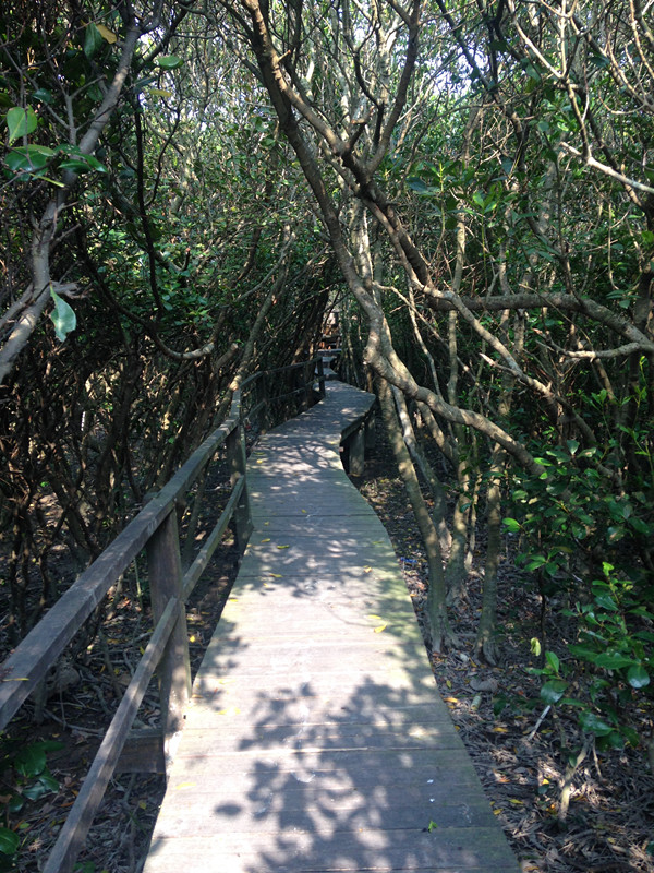 来红树林玩,最有趣的就是在涨潮时,这些树木被海水完全吞没,或者仅仅露出绿色的树冠,整片树林都浸泡在海水中,远远看去就像是一片此起彼伏的绿浪。