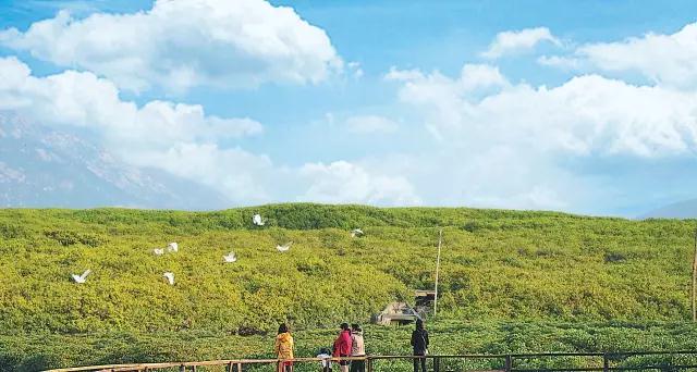 是在漳州云霄漳江出海口海滩上的漳江口红树林国际保护区,有2300多公顷,是中国第二大红树林群,也是我国北回归线北侧种类最多、生长最好的红树林天然群落。 它也被誉为北回归线北侧最美的海底森林。如果你泛舟游于江上,当小船深入林中,就会像是来到了亚马逊雨林一样。 在很多沿海城市不大可能看到红树林,因为只有在咸淡水的出海口,红树林才能繁殖存活,而像云霄县这样有如此大面积的,更是少见。 红树林是唯一一种生长在海水里的胎生植物,红树林的种子可以在树上的果实中萌芽长成小苗,脱离,坠落于淤泥中发育生长。 来红树林玩,最有趣的就是在涨潮时,这些树木被海水完全吞没,或者仅仅露出绿色的树冠,整片树林都浸泡在海水中,远远看去就像是一片此起彼伏的绿浪。 而到了退潮的时候,红树林就会完整地出现。神奇的是红树林就像是出淤泥而不染的莲花一样,即使被海水盖过树冠,你在退潮时看到的红树林依然是非常干净的。红树林也造就了这方土地的生态,因为水质干净气候宜人,红树林景区里有150多种鸟类、240多种水生动物和近400种水生物。所以来红树林,也不能忘了看一看这些生物。如果想要近距离欣赏,就可以在码头边上租借渔船出海,坐船来回大约三十分钟。