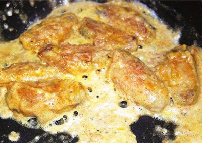 、 把咸蛋黄放入锅中翻炒至起泡,然后倒入鸡翅翻炒,待鸡翅表面裹匀咸蛋黄后关火。