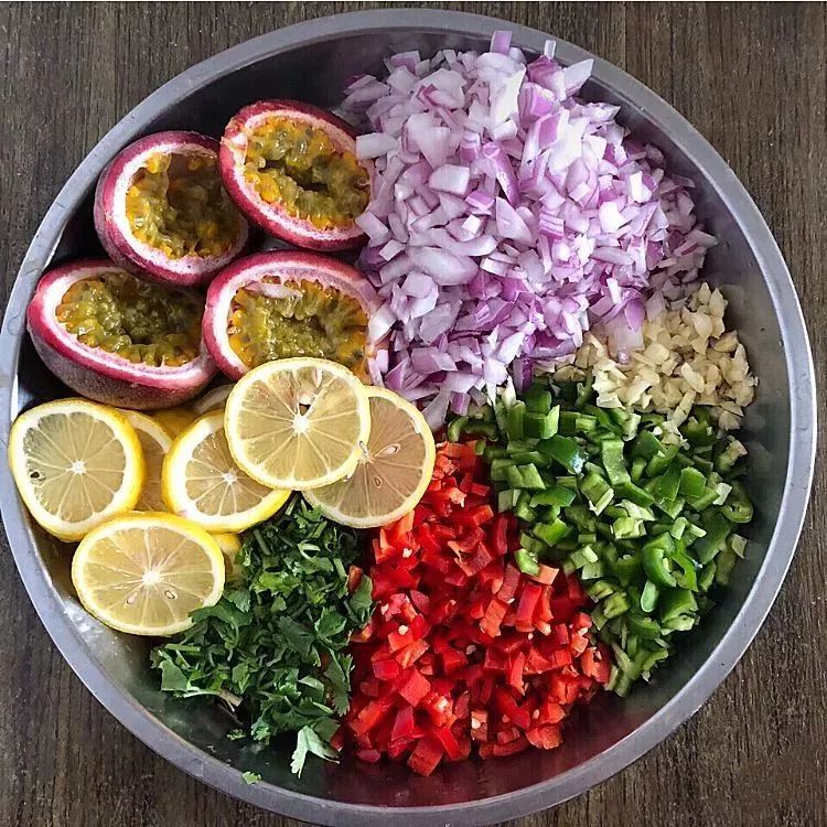 4.洋葱切末、姜蒜切末、香菜切碎、小米椒切圈,放盐、生抽、糖、白醋。柠檬一半切片一半挤出柠檬汁、百香果用勺子取果肉。调完之后可以尝一下咸淡。