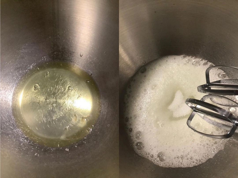 4、接下来是蛋清,用电动打蛋器打到起大泡泡的时候加入三分之一的糖继续打发。