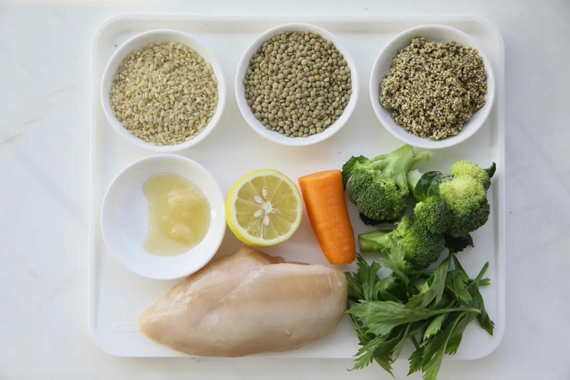 蛋白质......19.6 克,脂 肪......15.4 克,碳水化合物......51.1 克,膳食纤维......6.3 克,热 量......423.8 大卡食材:A 煎鸡胸用:鸡胸肉......1 块(约200 克),蜂蜜......5 克,柠檬......半个,盐......少许,橄榄油......5 克B 炒饭用:糙米......50 克,藜麦......50 克,西蓝花......3 朵,胡萝卜......半根,芹菜叶......一把,咖喱粉......3 克,盐和黑胡椒粉......少许,橄榄油......5 克做法:① 腌渍鸡胸 :将 A 中除鸡胸以外的食材混合均匀,并将鸡胸肉放入,腌渍30分钟左右;② 煎鸡胸 :将腌好的鸡肉取出,开中低火,一面煎 3~5 分钟后翻面,再煎3~5分钟即可。期间撒少许盐和黑胡椒粉;③ 炒饭:将糙米、藜麦混合,提前煮熟;平底锅开中火,将胡萝卜丁、西蓝花丁翻炒至熟。再依次加入煮好的杂粮饭、咖喱粉、盐、黑胡椒粉,翻炒至米饭均匀上色,出锅前加欧芹碎即可。香蒸柠檬三文鱼(约30分钟 | 晚餐