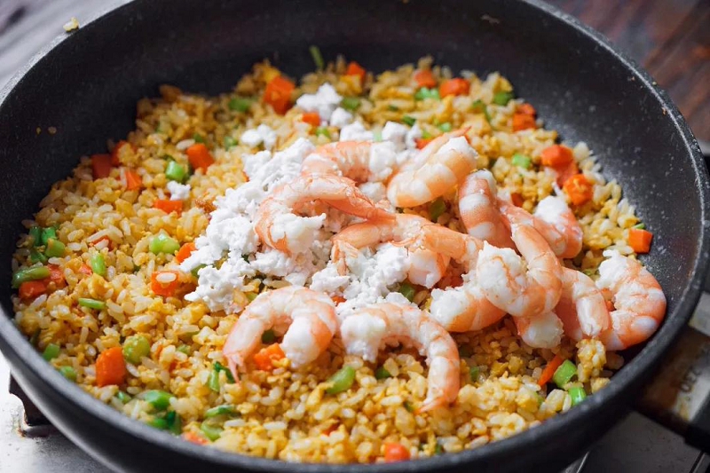 | [1楼] 幸福味道 新东方制造 ![]() ![]() ![]() ![]() 家里米饭煮多了 或者想不到吃什么菜 总是第一时间想到不如来个蛋炒饭吧 但是蛋炒饭是一道很考技巧的菜品 今天就来学一下怎么做出 吃了还想吃的蛋炒饭吧! 【蛋炒饭】 ![]() 食材 基围虾 / 胡萝卜 / 咸鸭蛋 / 鸡蛋隔夜饭 / 新鲜橄榄菜 / 午餐肉 ![]() 做法 1、半根胡萝卜切丁,一把新鲜橄榄菜去叶切丁。8只基围虾洗净挑虾线,虾头备用 ![]() 2、将1个咸蛋的蛋黄蛋白分离,分别捣碎;虾身入沸水锅,加1勺盐煮至七成熟后,剥壳备用。 ![]() 3、2个鸡蛋充分打散,倒入一碗隔夜饭中拌匀。*普通蛋炒饭是蛋饭分开炒,我们这个蛋液混合到米饭中,炒出来是米饭和蛋二合一,每粒米都是有蛋的黄金蛋炒饭。 ![]() 4、热锅冷油,下虾头炼油,当油呈金黄色时,将虾头捞出,弃之。 ![]() 5、虾油锅中下咸蛋黄碎略炒,加入胡萝卜丁、橄榄菜丁和拌了蛋液的隔夜饭翻炒至米粒均匀上色,再放入咸蛋白碎、虾仁继续翻炒,加1勺盐调味。 ![]() ![]() 6、午餐肉切3厚片,小火两面煎至金黄,备用。 ![]() 7、炒饭盛出,放上溏心蛋,铺上煎好的午餐肉,新·耳光炒饭完成! ![]() ![]() ![]() 图文转载,如侵联删 想学更多的美味课程, 成为2020最有FAN的人 记得要时刻关注厦门新东方哦~ ![]() 厦门新东方烹饪学校 2020年春季招生火热进行中 网上报名绿色通道同步开启 在家轻松一键搞定报名 技能+证书+就业 一份努力三份收获 扫描下方“二维码” 了解更多 End 青春正当时,学厨不犹豫 我们在厦门新东方烹饪学校 等待着你的到来 ![]() Because of you · have better of us 因为你 · 才有更好的我們 | |