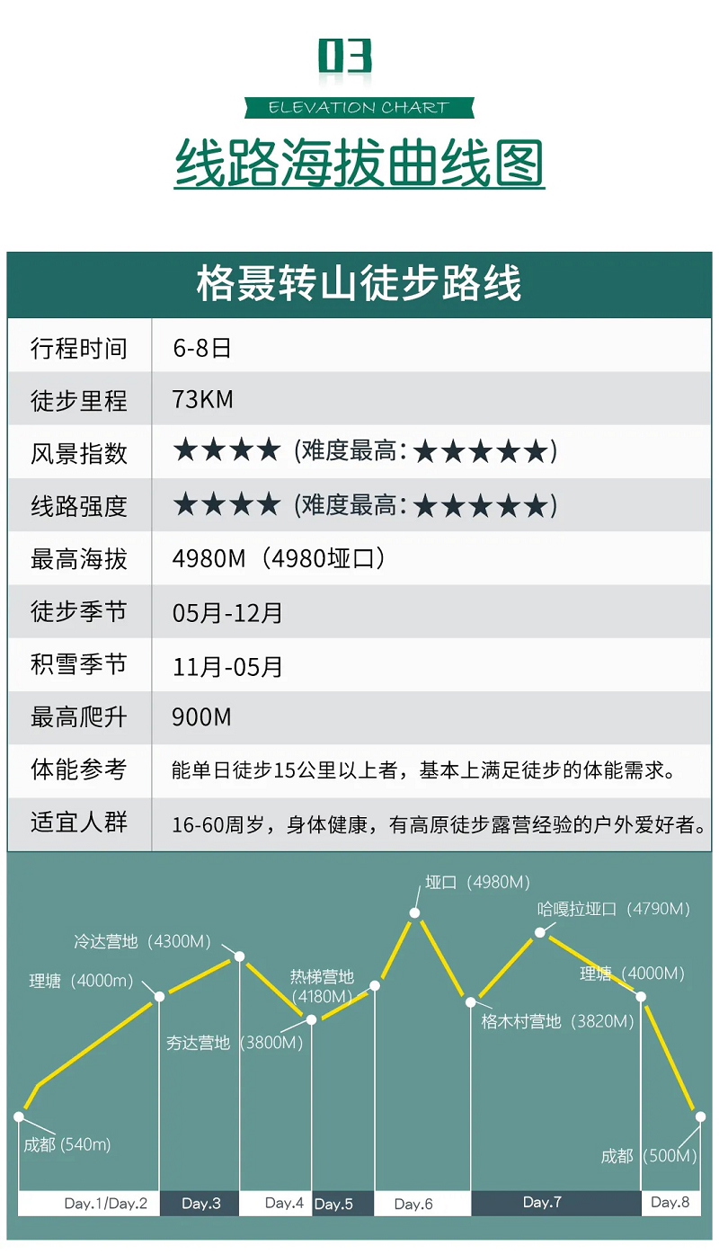【线路亮点】 [list=1] ![]() ![]() ![]() ![]() ![]() ![]() ![]() ![]() ![]() ![]() ![]() ![]() ![]() ![]() ![]() 2024年09月30日集合-10月07日散团(国庆节) 8月-10月星空季,夏季繁星漫天银河闪耀是摄影师的天堂 活动价格:5680/人 温馨提示:接受台湾及外籍人士报名,因住宿酒店差异需在原有价格基础上增加:非节假日240元/间(2晚);节假日380元/间(2晚) 报名咨询📞15960376389农民(微信同电话号) ![]() D1全国各地-成都 30号或1号成都集合(也可以提前飞成都等我们)。农民在成都坐等大家的到来。。。 今日全国各地的队友将来到成都集合,统一入住我俱乐部安排的酒店。如果您的时间比较宽裕,还可以自行安排在成都市区的旅游活动,推荐游览锦里、武侯祠、杜甫草堂、宽窄巷子等景点,品尝成都特色美食,感受天府之国的休闲生活,相信绝对会让大家深深地体会到什么是“休闲之都”啦! 住宿:成都市区酒店(双人标间独卫)(温馨提示:集合日为自由活动,不是正式的行程,请在自由活动时注意人身财产安全,集合日不含保险。到集合酒店报“线路名+姓名”拿房,房费已付,押金自付,一般在出发前3天,我们会将酒店信息发送到您的手机。) 成都-390km-康定-294km-理塘 餐饮:含早、中、晚餐 需时:成都-理塘行车约9小时 D2成都-390km-康定-294km-理塘 早上5:00左右在酒店集合出发,酒店准备路餐(牛奶,面包等,)在前台退房时自取,经成雅高速公路抵达雨城雅安,之后上雅康高速,到达跑马溜溜的康定城,之后翻越康巴第一关折多山,大约一小时后到折多山垭口(海拔4298米),稍作停留休息、拍照后继续西行,之后经过新都桥,到达雅江,翻越高尔寺山、剪子弯山和卡子拉山,下午18:00左右到达理塘。 住宿:理塘县城酒店(双人标间) 海拔:(成都540m) 康定(2900m) 理塘(4014m) D3理塘-20km-铁匠山垭口-51km-喇嘛垭-26km-冷达-1.5km-虎皮坝-3.5km-老冷古寺-5km-冷达营地 餐饮:含营地早、晚餐,午餐路餐自理 需时:乘车4小时,徒步往返8.5公里,4小时左右 D4冷达营地-2km-新冷古寺-11km-夯达营地 餐饮:含营地早、晚餐,午餐路餐自理 需时:全天徒步约5小时13公里, D5 夯达营地-10km岛岛河谷-3km热梯-温泉营地早餐过后离开夯达营地,从营地出发便开始爬坡,上到山脊之后,便开始一路横切,今天最大的难点就是在这段横切,需要翻越十几个大大小小的峡谷,对体能来说是一个考验,但是在这里,一路都是草甸,一路都是各种各样的野花,一路都能够看见格聂神山,形影不离的陪伴左右,足以让你忘记疲惫,享受美景;下午经过最后一道峡谷,也是最大的一个岛岛河谷,之后便能够看到今天营地了,今天的营地位于热梯河谷之中,这里是最后一个能够看到格聂神山的营地;翻过岛岛河谷旁边的山脊,一路向下经过一条河,再往河谷深处走几公里就到今天的营地了。大约下午三点左右就到今天的营地了。 住宿:露营 海拔:热梯营地(4180米) D6热梯营地-耶勒沟-10km-4980垭口-12km-格木村 餐饮:含营地早、晚餐,午餐路餐自理 需时:徒步约10小时22公里, D7格木村-哈嘎拉垭口-10km-哈日-10km-营地安久村-70km-理塘 餐饮:含营地早、晚餐,午餐路餐自理 需时:徒步约6小时,徒步约18km,乘车约3小时 D8理塘-294km-康定-390km-成都 餐饮:含早、中餐 海拔:理塘(4014米) 成都(500米) 需时:全程行车约9小时 D9成都-厦门 订今天的机票返回厦门,或自行安排返程行程。 ![]() 【费用包含】: [list=1] [list=1] 第一类:服装装备 [list=1] [list=1] 第三类:露营装备 [list=1] [list=1] 【报名要求】 无严重高山反应及心、脑、肺,精神疾病,体能良好的户外爱好者 【关于高原反应的应对措施】 [list=1]