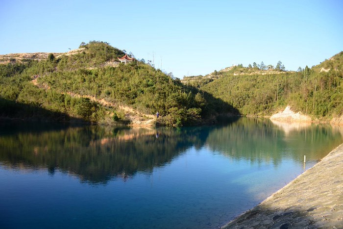七彩池被誉为“闽南小九寨”七彩池是在军营村,养在大山“深闺”的七彩池也吸引了广大市民的关注,并成为一处旅游、休闲景观;闻名遐迩的七彩池环着小山,呈月牙形状,溪水晶莹剔透,清澈见底。更让人惊艳的是,因为各种矿物质沉积,再加上光的折射现象等多种自然条件综合作用,七彩池形成了五光十色的瑰丽景色,因此,也被称为“闽南小九寨”;