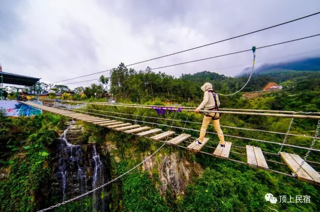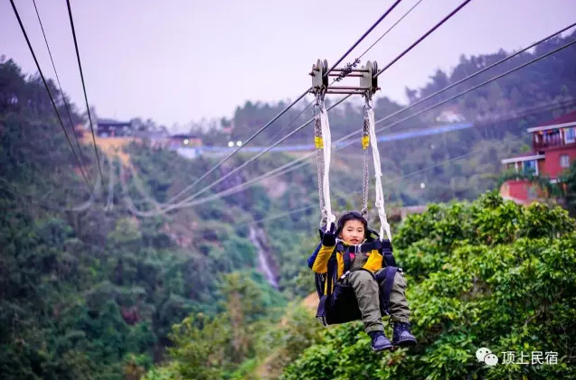 空中滑索 讲到刺激冒险又有速度快感的户外活动,空中滑索(zipline)可算是其中一个。特殊的是,可以提供这样活动的地方并不多,因为除了专业以外,还需很多地形地利的配合,刚好顶村就有这个优势。 顶上乡村空中滑索就是这么一项具有挑战性、刺激性和娱乐性的现代化体育游乐项目。游客穿戴吊具,悬挂在滑动小车下,以斜拉的两根钢绳为轨道,利用重力,跨越草地、树丛、溪流、山谷,借助高低之差从高处以较高的速度向下滑行。凌空飞渡,感官放大,在速度与美景中获得心理和视觉的双重体验,享受滑索的速度与激情。挑战者们在有惊无险的快乐中感受刺激和满足。 顶上乡村空中滑索有296米,落差47米左右,是目前华东地区最长的空中滑索。