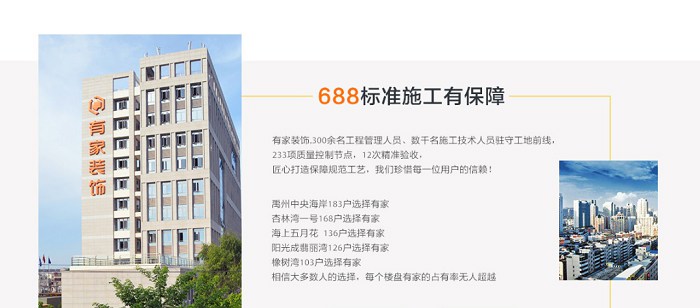 有家装饰联合品牌建材隆重推出688元/㎡省到家实惠装修套餐,以极其优惠的价格打造精品样板房工程。公司规模化的装修更加省钱,快来了解吧!
