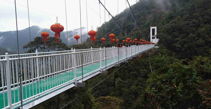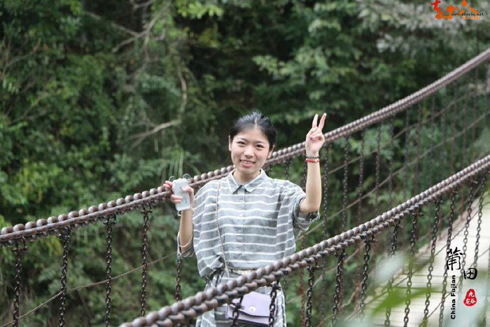 (6)14:30-- 体验中国首座7D玻璃天桥,桥面长300米宽3米距谷底相对高度约200米。百余名省内时尚达人见证体验、大呼过瘾。这是九龙谷景区继打造福建省首个飞拉达高空攀岩项目、福建省最长水上高空滑索、福建省关卡最多的丛林飞跃项目之后,向广大游客奉献的又一“之最”力作,当然这种走天梯的感觉还能将九龙谷的美丽风景尽收眼底纵横群山之间恍若人间仙境。