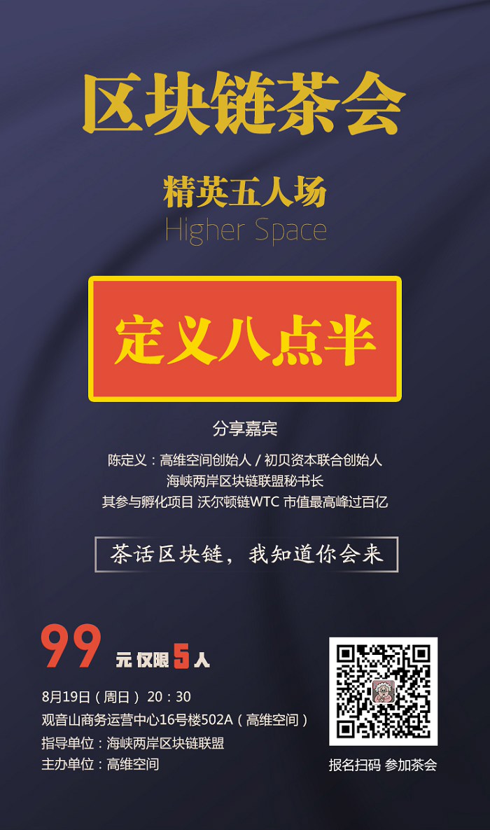 | |  | 活动须知第三期“定义八点半”开启报名🎉,仅限5个名额, 厦门首个有关区块链的五人精英茶会, 区块链的“一问一答”模式, 精致水果,晚间茶会, 肚子和脑子,总有一方会填满, 让你带走的不仅是干货,还有结识圈友的机会,二维码咨询报名。