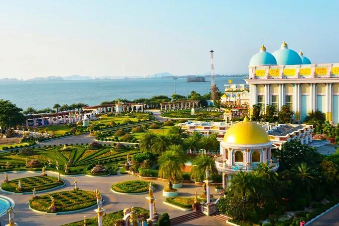 富贵黄金屋是泰国芭堤雅的一个真正富丽堂皇的风水宝地,庄园里有一纯金望海观音金佛,所以称“富贵黄金屋”。庄园濒海而建,占地18万多平方米。一进庄园大门,便有一只孔雀迎面而来,看到俊男靓女,立即开屏,争奇斗艳。庄园十分气魄,雕梁画栋,无论建筑设计,还是景观雕塑环境,称得上艺术精品,美不胜收,说是庄园,简直就是一座宫殿。来此欣赏望海观音,让你体验有钱人的奢华生活。这个庄园也是十多年前红遍东南亚的青春偶像剧《流星花园》的外景取景地。