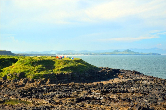 露营地,空中鸟覧构造像只盯着渔港的小猫。此岛一侧连着沙滩上,沙质洁净;沙滩坡度平缓,在夕阳的照耀下,沙滩上黄金点点,踏浪漫步,冲浪遨游,尽情享受海天一色的美景。此沙滩小且偏僻无名、少有游客光顾,故而特别的干净、细腻、柔软,每当潮起潮落时只有当地辛勤的渔民出海、归来。岛上是难得可见的绿色草坪,天然、美丽、可观夕阳,可看日出。是一个真正可以称的上的五星级的露营地!