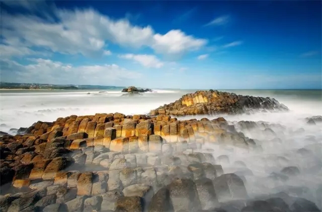 ,实景观看火山口,远眺林进屿,作为景区观赏重点的古火山口,距今2460万年,形状似一个朝天的椭圆形喇叭口,开口处顶端直径50米,底部深3米,涨潮时海水淹没底部,只有退潮时才可以看到完整的火山口。火山曾历经15次喷发,如今可见的喷发物距今约2460万年。它的喷发机理完整,层次清晰,整个火山口保存完好,因而被地质学家誉为“中外罕见的古火山博物馆”和“兵马俑”,也是世界保存完好的海底古火山口之一。沿火山口游步道走到海边近距离观看海边的相关火山遗迹。稍作休息。