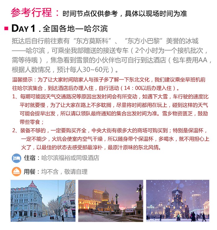 ★ 连续四年东北带队经历,行程更加优化,玩得更加开心,服务用心体验!全程自家领队,杜绝一切不必要的消费,让您以最实惠价格享受最快乐的行程!!